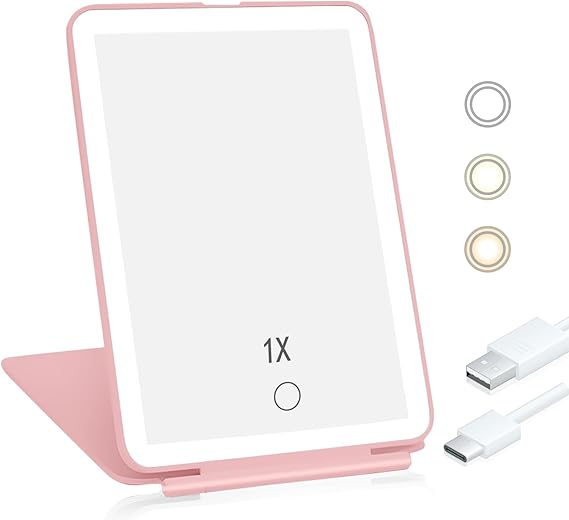Koolstuffs Travel Mirror for Makeup, Rechargeable Light up Pink Mirror with 72 LED Lights and 1000mAh Batteries, 3 Colors Light Modes USB Portable Desktop Mirror with Dimmable Touch Screen (Pink)