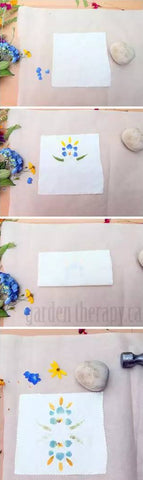 -Hold the cotton cloth tightly and tap the petals on it with a hammer or stone. You will soon see the color of the petals dyed on the cloth. Continue tapping until the color is satisfactory to you.