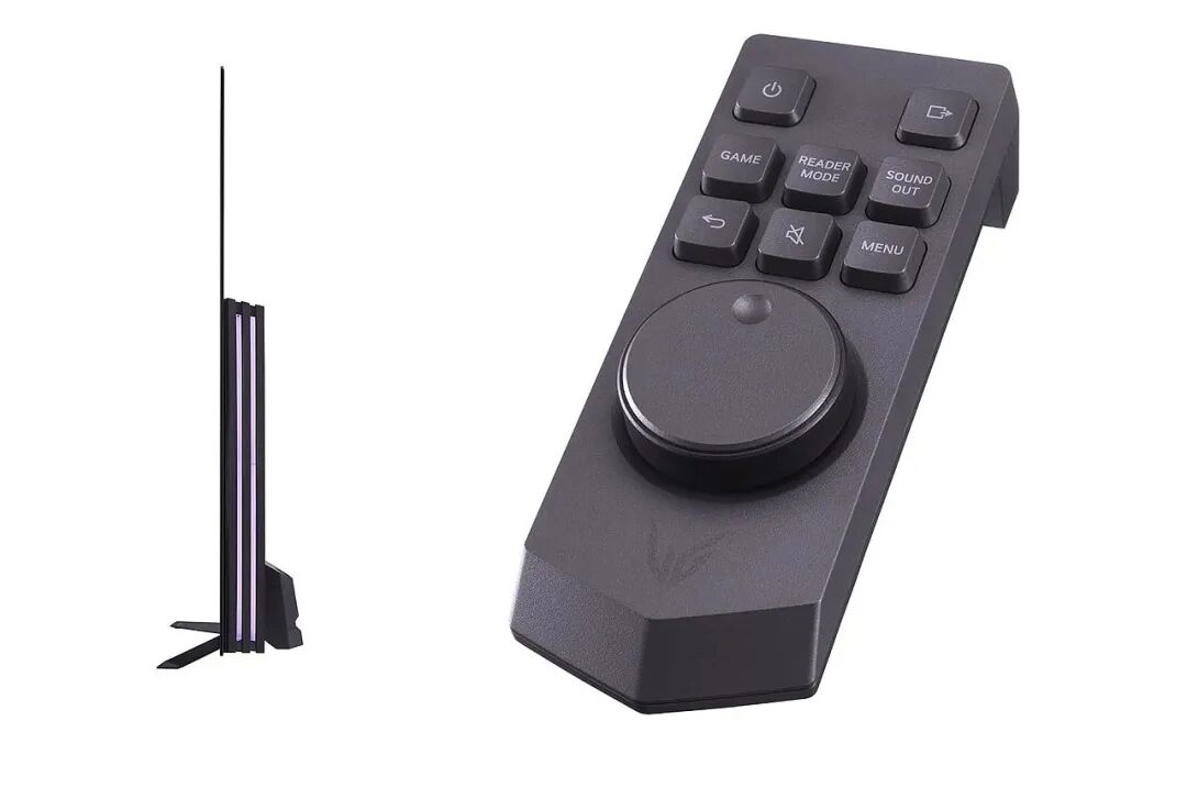 The LG UltraGear 48GQ900 has built-in 20W stereo speakers, a 3.5mm four-pole headphone jack, and a dual-port USB3.0 hub. It comes with a remote control that can be used for gaming. The remote has a game mode toggle and more buttons for power, mute, video in, and audio out.