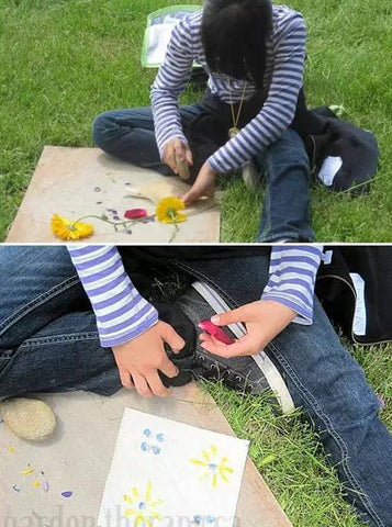 -Hold the cotton cloth tightly and tap the petals on it with a hammer or stone. You will soon see the color of the petals dyed on the cloth. Continue tapping until the color is satisfactory to you.