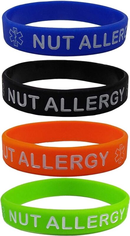 “NUT Allergy” Silicone Wristbands – Blue, Orange, Green and Black (4 Pack) (Very Small Size 5-1/2 inches)