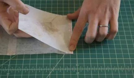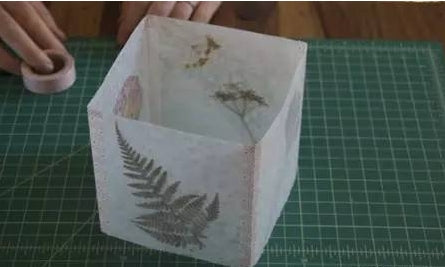 6. Turn the cover over and flatten the excess tape on the reverse side. “Close” the two panels and press your finger along the tape to make the crease a little deeper. Continue this step to connect the panels until the four panels form a cube.