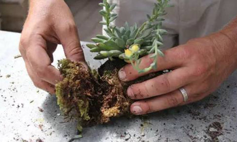 Place the plant roots in the center of the moss with the moss surface facing down, completely wrapping the roots with the moss and pressing lightly with your thumbs to make sure they are held together.