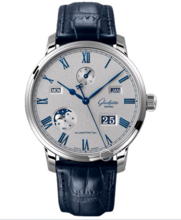 This is a Glashütte Original Senator Series 1-36-12-03-02-61 watch. This watch is equipped with an automatic mechanical movement. The case is made of stainless steel, with a Louisiana alligator leather strap and electroplated gray particles. Textured dial with 5N solid gold inlaid Roman numeral hour markers