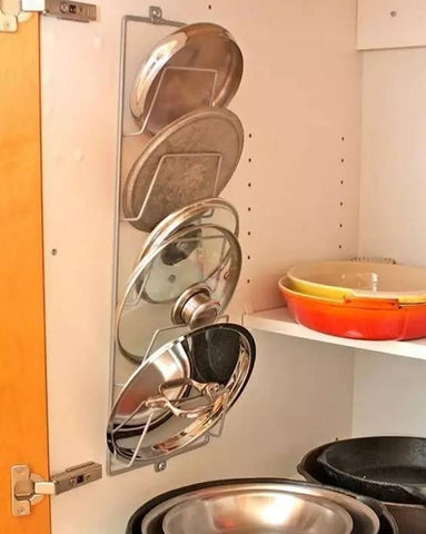 2. Pot lids take up the most space. Do you have no place to put them? Nail the magazine rack in the locker or wall to create a special storage space for the pot lids.