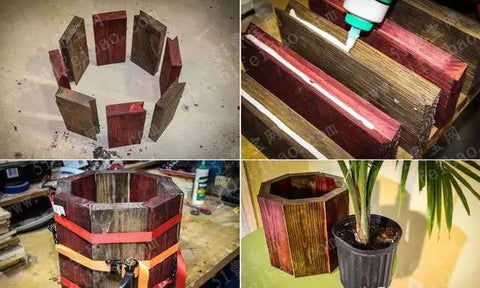 3. Use Mugong glue to stick the side panels of the wooden flower pot cover. Before the glue dries, use a tie to only tie the sides of the flower pot cover.