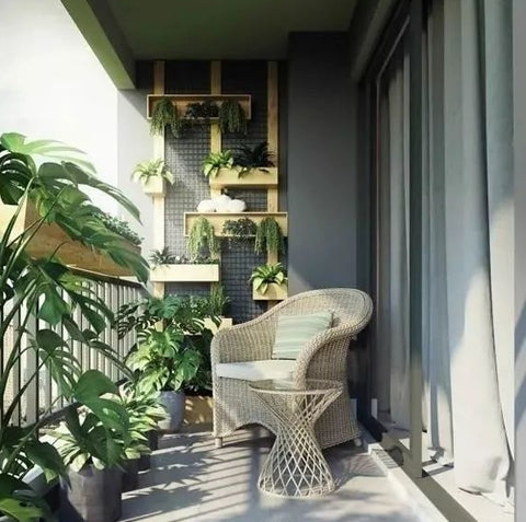 2.This balcony is filled with green plants, and there is a small seat and table. When you have nothing to do, you can sit here, read a book, drink tea, and enjoy this peaceful and beautiful day.