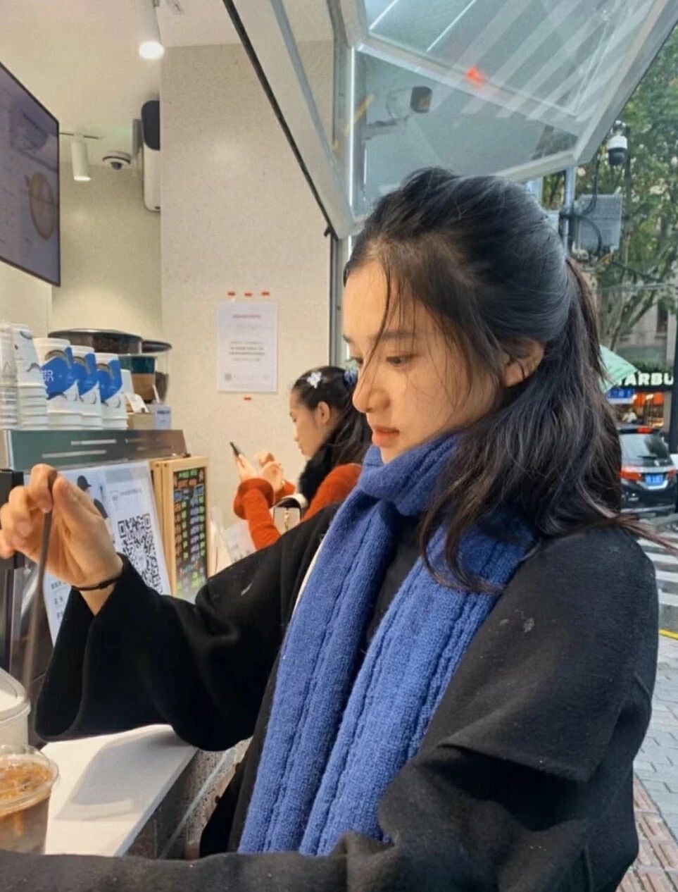 In addition to red, blue scarves with equally high saturation are also very suitable for brightening autumn and winter. Zhang Jingyi’s blue scarf has a very suitable tone. The right blue color is a great tool for whitening in autumn and winter.