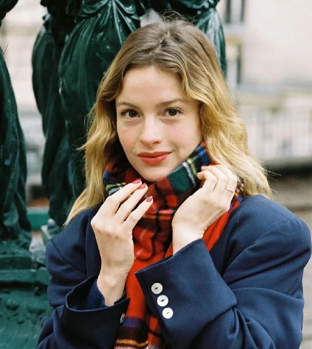 This scarf from Acne Stuidos has a blue-brown plaid paired with a blue coat, and she is standing in the snow looking into the camera, overflowing the screen with pure beauty.
