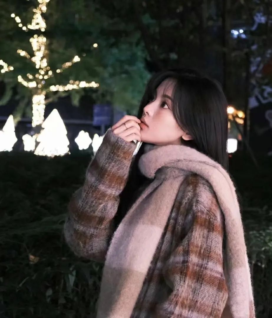 The green plaid scarf in the photo is also very eye-catching. The breeze is blowing her hair, coupled with her signature healing smile, it is like the warm sun in winter, bringing people warm healing power.
