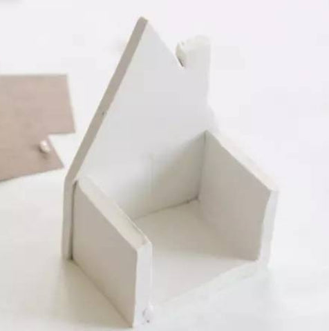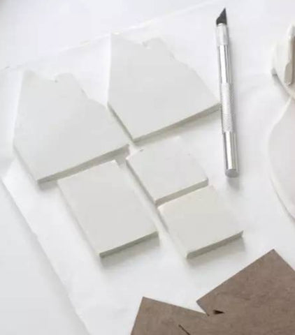 You need: 1. Pen knife 2. Bakable clay 3. Rolling pin 4. Non-stick baking paper 5. Ruler 6. Print and cut out the house shape mold. 7. Smooth processing