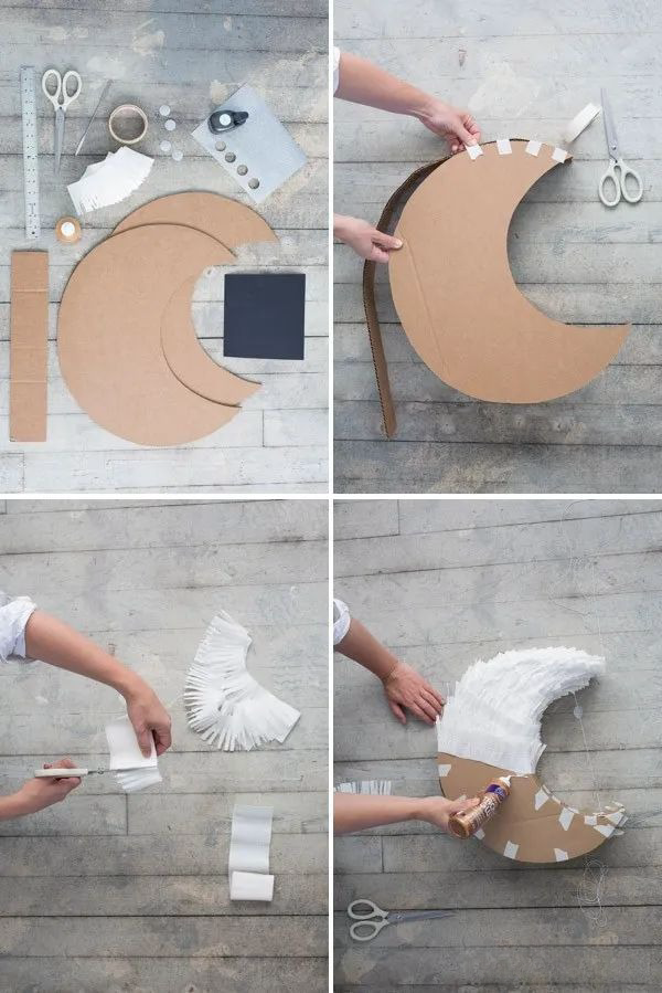 Tools and materials: cardboard, tape, paper strips, white latex, ruler, scissors