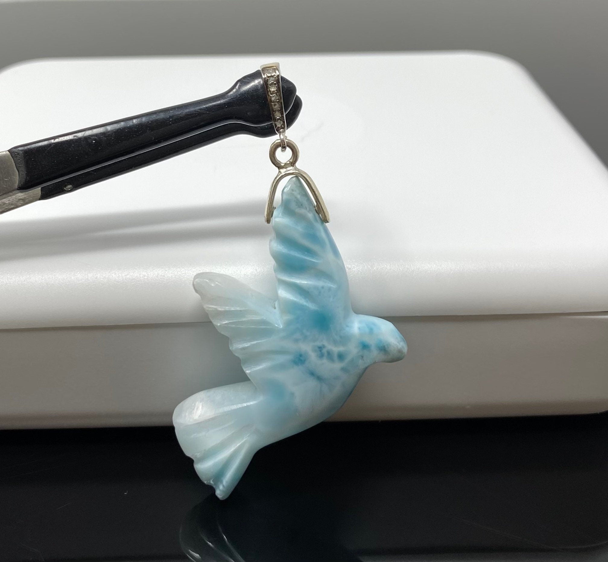 This beautiful Handmade AAA Grade Natural Hand Carved Larimar Silver Pendant with Pave Diamond Bail in Black Gray Ruthenium in the front around the diamonds over Sterling Silver is an excellent choice for any occasion and makes a great gift for the loved ones.
