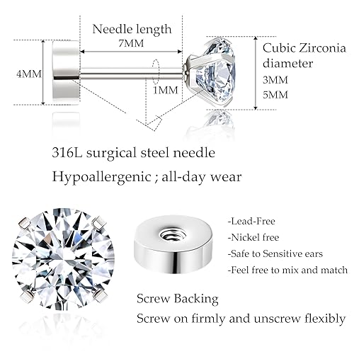 This item: 2 Pairs Flat Back Earrings for Women | Cartilage Earring | Stainless Steel Earrings | Titanium Earrings | Nickel Free Hypoallergenic Earrings | Cubic Zirconia Earrings Studs(3mm+5mm, Silver)