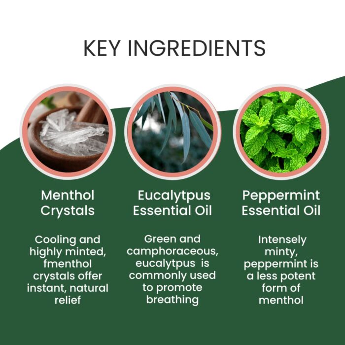 Ingredients (*=Organic) Eucalyptus Globulus Leaf Oil*, Mentha Piperita (Peppermint) Oil*, Mentha Viridis (Spearmint) Leaf Oil*, Abies Sibirica (Siberian Fir) Needle Oil*, Melaleuca Alternifolia (Tea Tree) Leaf Oil*, Lavandula Angustifolia (Lavender) Oil*, Pure Menthol Crystals*