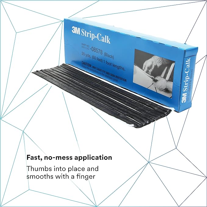 With its durable butyl rubber construction and permanently-pliable formula, our 3M Strip-Calk is ideal for filling non-visible automotive joints, seams, voids and gaps. This thumb-grade seam sealer arrives ready to install without mixing, spraying or tools. It thumbs in quickly and smooths with a fingertip. And its high heat resistance also makes it suitable for applications including engine compartment seams and firewalls.