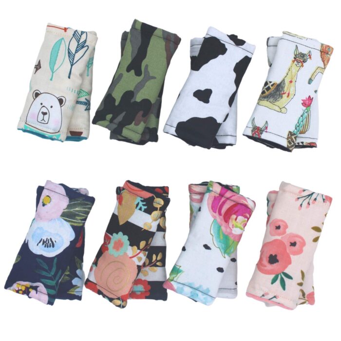 Grab a pair of reversible cotton baby car seat and/or stroller strap covers in your choice of fabric. They are ideal for covering any seat belt – pram or stroller straps, capsule or car seat straps, bike seat or high chair.