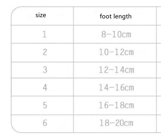 Children’s socks size: 0-6 months (recommended 8-10cm feet), 6-12 months (recommended 10-12cm feet), 1-3 years old (recommended 12-14cm feet), 3-5 years old (recommended 14cm feet) -16cm feet), 5-7 years old (16-18cm feet are recommended)