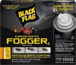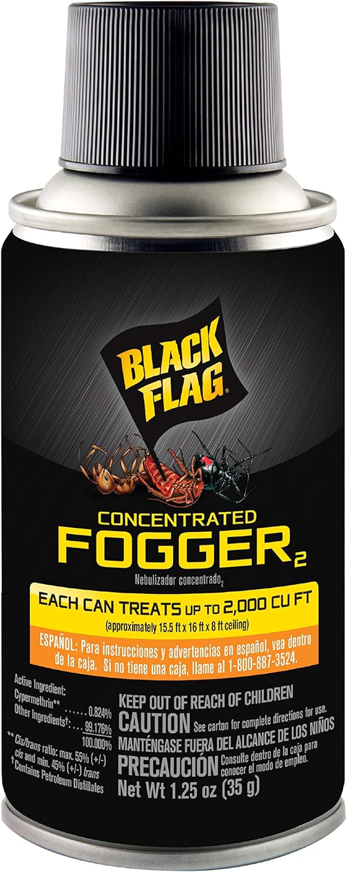 Insects invading your corner of the world? Whatever insect you’re fighting, Black Flag products are dedicated to providing the tools you need to regain control. With formulas that act fast and never back down, Black Flag insect controls have been arming homeowners in the battle against invading bugs for more years than any other brand.Stop bugs before they raid your kitchen and home with Black Flag Concentrated Fogger. This package contains 6 aerosol cans that release a concentrated fog. Each 1.25 oz can treats a room up to 2,000 cubic feet (or approximately 15.5 feet by 16 feet with an 8-foot ceiling). Black Flag Concentrated Fogger controls a variety of household pests, including roaches, ants (except fire, carpenter, harvester and pharaoh ants), fleas, spiders (except brown recluse), mosquitoes, silverfish, brown dog ticks, houseflies and more as listed. Keeps killing German cockroaches up to 12 weeks on non-porous surfaces. This product will not control bed bugs.Black Flag Concentrated Fogger won’t leave a wet, messy residue. It’s perfect for use in apartments, homes, attics, basements, garages, and household storage areas. Includes convenient hang tags to alert others when they can safely re-enter treated area. Available in pack of 1 includes four individual packages of 6 foggers