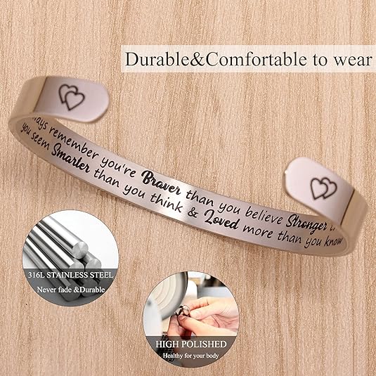 • Inspirational Bracelets Material: 316L stainless steel. It will not rust, stain or fade. Simple, elegant bracelet, will not scratch the skin. Cuff bracelets also can be teen girl gifts, gifts for teenage girls to encourage her to live better.