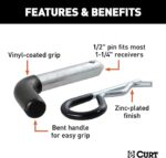 The job of a hitch pin is incredibly important in towing, and for this reason, CURT hitch pins and clips are made to be of the utmost quality, providing you with reliable security for your trailer and cargo. CURT 1/2″ hitch pins measure a full half inch in diameter and are constructed from solid steel. This helps ensure they have the strength they need to serve your towing needs. Our 1/2″ pins are available in a number of finishes to give you options for your specific vehicle and trailer hitch. This 1/2″ hitch pin features a zinc finish and comes with a standard retainer hole to accept the included clip. It also has a vinyl-coated handle on both the hitch pin and clip to allow for a better grip. All CURT 1/2″ pins come with a 105-degree bend, making them easier to handle and operate when mounting your ball mount. 1/2″ hitch pins will fit any CURT ball mount or hitch-mounted accessory with a 1-1/4″ shank.