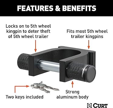 - CURT specialty locks are a line of unique towing locks that provide the security you need to keep that trailer and those toys safe from theft. It does not matter where the road takes you; if you are towing, you want the peace of mind to be able to enjoy yourself, and that peace of mind only comes with a CURT lock. One specialty lock offered by CURT is the kingpin lock. This key-operated lock is made specifically for 5th wheel trailers. It easily slips over a 5th wheel trailer’s kingpin and ensures that the trailer cannot be towed away without your permission. With a universal design, it is able to fit most 5th wheel trailers on the market today. The CURT kingpin lock is made of strong aluminum and is key-operated. For all of your trailer security needs, look to CURT for the lock to keep that boat, RV, toy hauler — whatever it may be! — safe and sound.