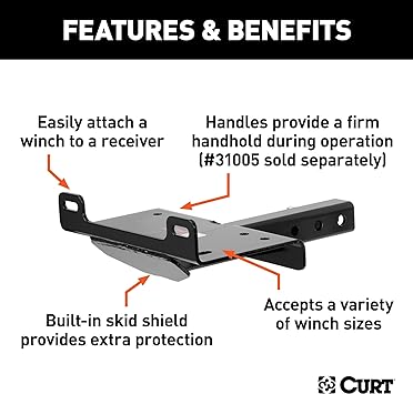 - CURT front mount accessories are a unique line of towing accessories that maximize the usefulness of your tow vehicle and give you that added edge on and especially off the road. A CURT front mount trailer hitch is the first step in making your vehicle the ultimate towing machine, and with it comes a variety of towing possibilities you might not even know exist. The CURT winch mount provides a solid mounting place for your winch. It fits a variety of winches and serves as a shield, guarding your winch against rock damage and debris while you are blazing an off-road trail. The CURT winch mount can also accept the CURT winch mount handles to allow for easier transportation of your winch when removing it from your vehicle. The handles also offer a firm handhold when operating your winch. The CURT winch mount is equipped with a shank that fits into a 2″ x 2″ receiver tube and has three mounting holes for an adjustable design.