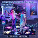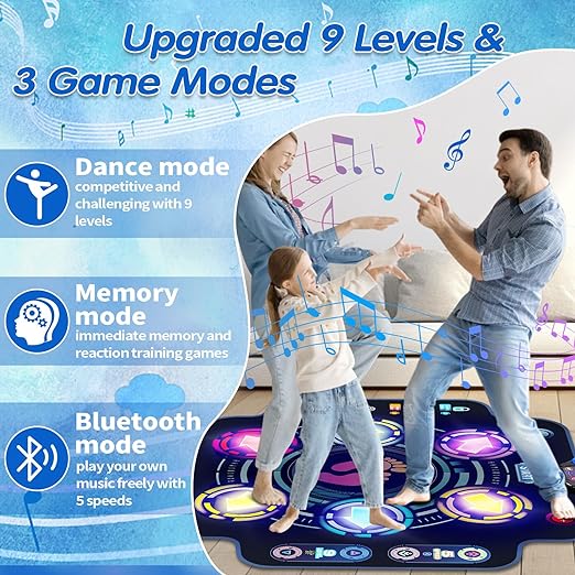 - 💃【2024 Upgraded Bluetooth Function & 5 speed Levels &Memory Function】– Unique Bluetooth mode with adjustable speed is now coming! The dancing mat is easy to connect with Bluetooth to play your favorite music so that kids can invite friends to join in the dance. Light-up bluetooth dance pad has 5 speeds – helping you to choose more fun while experiencing dance activities. Memory mode exercises the brain and improves your child’s memory in a fun way.