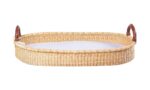 Our changing basket is made from sturdy elephant grass and paired with a pad, beautifully quilted liner, and waterproof sheet. Elephant grass is similar to hay. Each basket is finished with the highest quality leather.