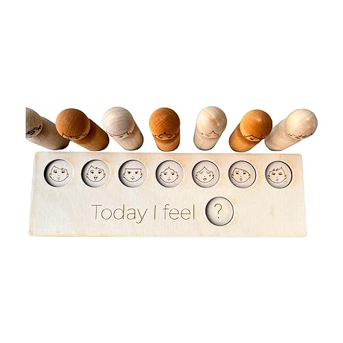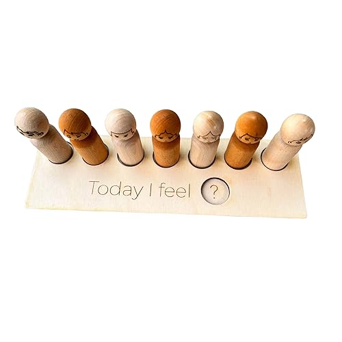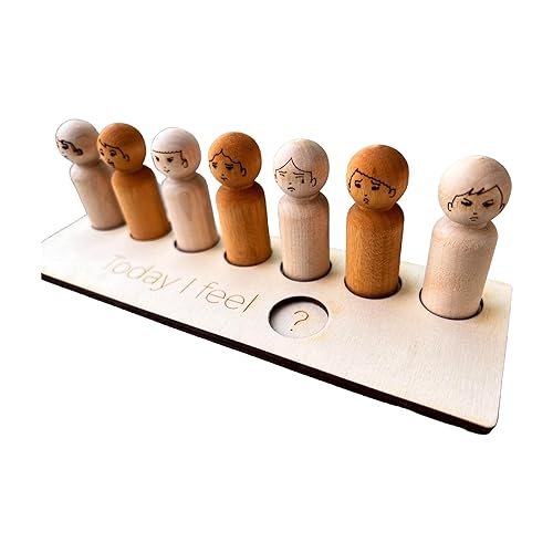 Set of 7 wooden peg dolls with different emotions. Help kiddos identify and express their feelings with this cute emotion face matching game. This is perfect for Montessori or Waldorf Classrooms or homes. Super cute unique one of a kind.