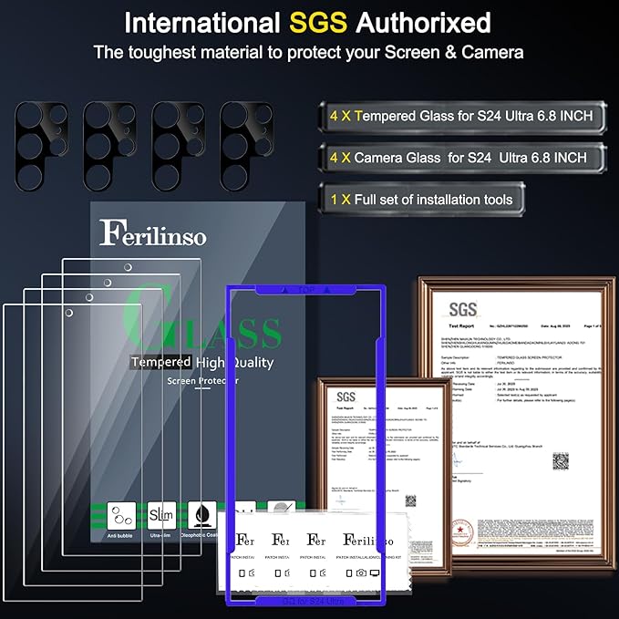 - Fingerprint Suitable: Perfect Support for Fingerprint unlock. Tips, for better use of fingerprint unlocking. After installing tempered film, you need to complete this step: open “Settings” → open “Display” → open “Touch sensitivity”, finally Re-record your fingerprint. In this way, you will get a perfect fingerprint unlock and super fast. The Ferilinso bundle includes: [4 Pack Glass Screen Protector & 4 Pack Camera Protector for S24 Ultra] [Includes mounting frame and cleaning kit].