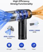 - Diseño de luces LED: después de encender el plumero de aire eléctrico, la luz LED se iluminará automáticamente, por lo que es fácil para ti limpiar esquinas oscuras y aportar una gran comodidad a tu limpieza. Para apagar la luz LED, haga doble clic en el botón.