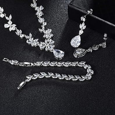 • ★ High Quality Material ★ : This Women’s Jewellery Set is made of 18K White Gold Plated & Clear Cubic Zirconia. High Polished. Nickel-free, Hypoallergenic and Shiny Forever. Our Jewellery are suitable for almost all Of Sensitive Ears.