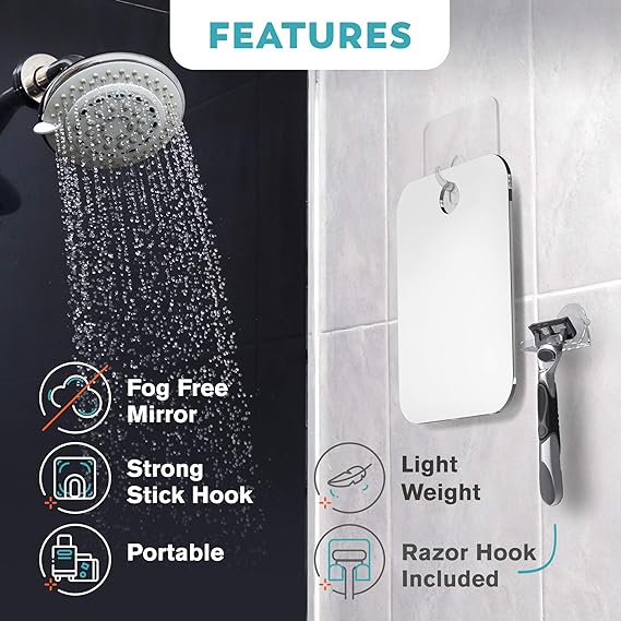 - Quick and Easy Installation: Our fogless mirror for shower can be effortlessly placed on any surface using the included command strips with hooks. Enjoy a secure and sturdy installation without the need for drilling or damaging your bathroom walls.