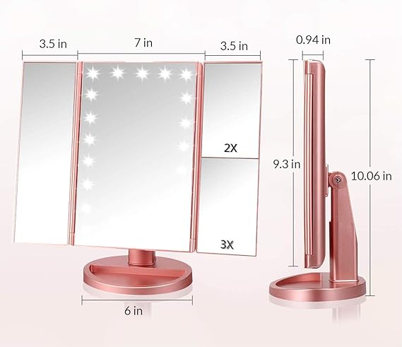 • 【3-WAY PERFECT VIEW】You can fix the LED vanity mirror at any position as needed, rotate to 2X/3X magnifying mirror on its right side to get the perfect perspectives. There is a 3 panels vanity mirrors provided with wide angle viewing, Convenient for shaving and makeup. The dimension of unfolding mirror face is about 9inch *14 inch.