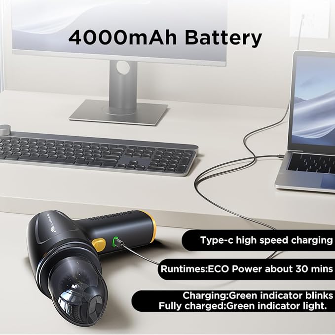 • 【Inalámbrico y recargable】: aspiradora recargable inalámbrica KJBAO equipada con batería de litio de 4000 mAh, se puede cargar rápidamente completamente en 3-4 horas y se puede utilizar alrededor de 30 minutos. Diseño inalámbrico, sin grilletes de alimentación, el maletero del coche/el estante superior del armario se puede limpiar fácilmente.