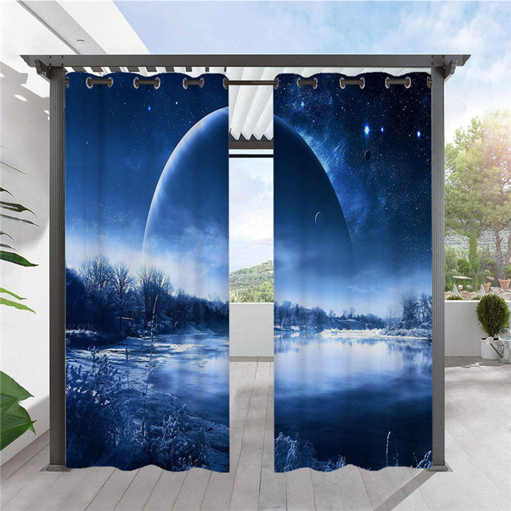 Modern Blue Galaxy and River Outdoor Curtains 3D Scenery Cabana Grommet Top Curtain Waterproof Sun-proof Heat-insulating 2 Panels