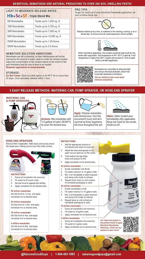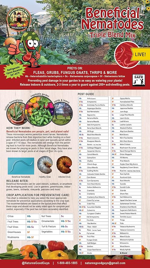 These microscopic round worms are natural biological control against:Grubs, Japanese Beetle Larva, Cucumber Beetles, Maggots, Ants (Queen),Asparagus Beetles, Bagworms, Banana Moths, Banana Weevils, Berry Root Weevils, Bill Bugs, Black Vine Weevils, Borers –Iris, Tree, Vine, Carrot Weevils, Chafers, Citrus Weevils, Colorado Potato Beetles, Corn Root Worms, Cranberry Root Weevils, Cucumber Beetles, Cutworms, European Chafers, Flea Beetles, Fleas –Adult, Gall Midges, Grape Root Borers, Grubs, Japanese Beetles, Lawn Grubs, Masked Chafers, May/June Beetles, Onion Maggots, Pill Worms, Raspberry Crown Borers, Root Weevils, Scarabs, Sugarcane Stalk Borers, Sweet Potato Weevils, Termites (Queen), Ticks and more than over 200 species of soil pests!