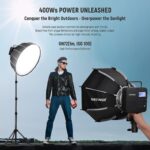 - 【IF Design Awarded 400Ws Outdoor Flash】Q4 400Ws battery powered strobe light boasts a compact rectangular design, measuring 7.28″x6.06″x8.35″ and weighing just 4.94lb, suitable for both outdoor photography and studio setup. With its impressive GN72 with a high performance reflector (not included), 30W/5600K/CRI95+ LED modeling lamp, and convenient top handle, it caters to various shooting needs. Note: Do not trigger the flash without plugging in the flash tube, as it will damage the equipment.