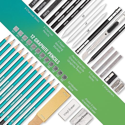- NOVICE TO PROFESSIONAL: start sketching as soon as you open the drawing kit! Complete drawing supplies set with a sketch pad, art pencils, kneaded eraser, pencil sharpeners, and more.