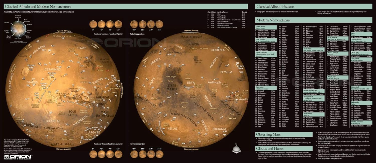 Explore our next-door neighbor planet Mars like never before with the Orion Mars Map and Observing Guide. This detailed map will help you locate and identify intriguing Martian features, and it will also help you learn interesting facts about the red planet. The Orion Mars Map and Observing Guide is a useful tool for backyard astronomers of all skill levels who want to get more out of their telescopic observations of Mars. Use the map to identify classical albedo features (light and dark regions) observed with a telescope. It also identifies over 150 Martian features using modern nomenclature. Throughout the tri-fold Mars Map and Observing Guide, you’ll find sections loaded with information on dust clouds and storms, Martian seasons, polar ice caps and more. You’ll appreciate the thorough list of recommended filters to help enhance visual views and astrophotos of Mars, as well as the detailed list of all upcoming conjunction and opposition events from 2014 through 2020. The Mars Map and Observing Guide measures 25.25 inches x 11 inches when unfolded, and folds up to a convenient 8.5 inch x 11 inch size for storage and transport. The Mars Map and Observing Guide is plastic laminated for long-lasting durability as well as protection against dew, dirt, and the occasional coffee spill.