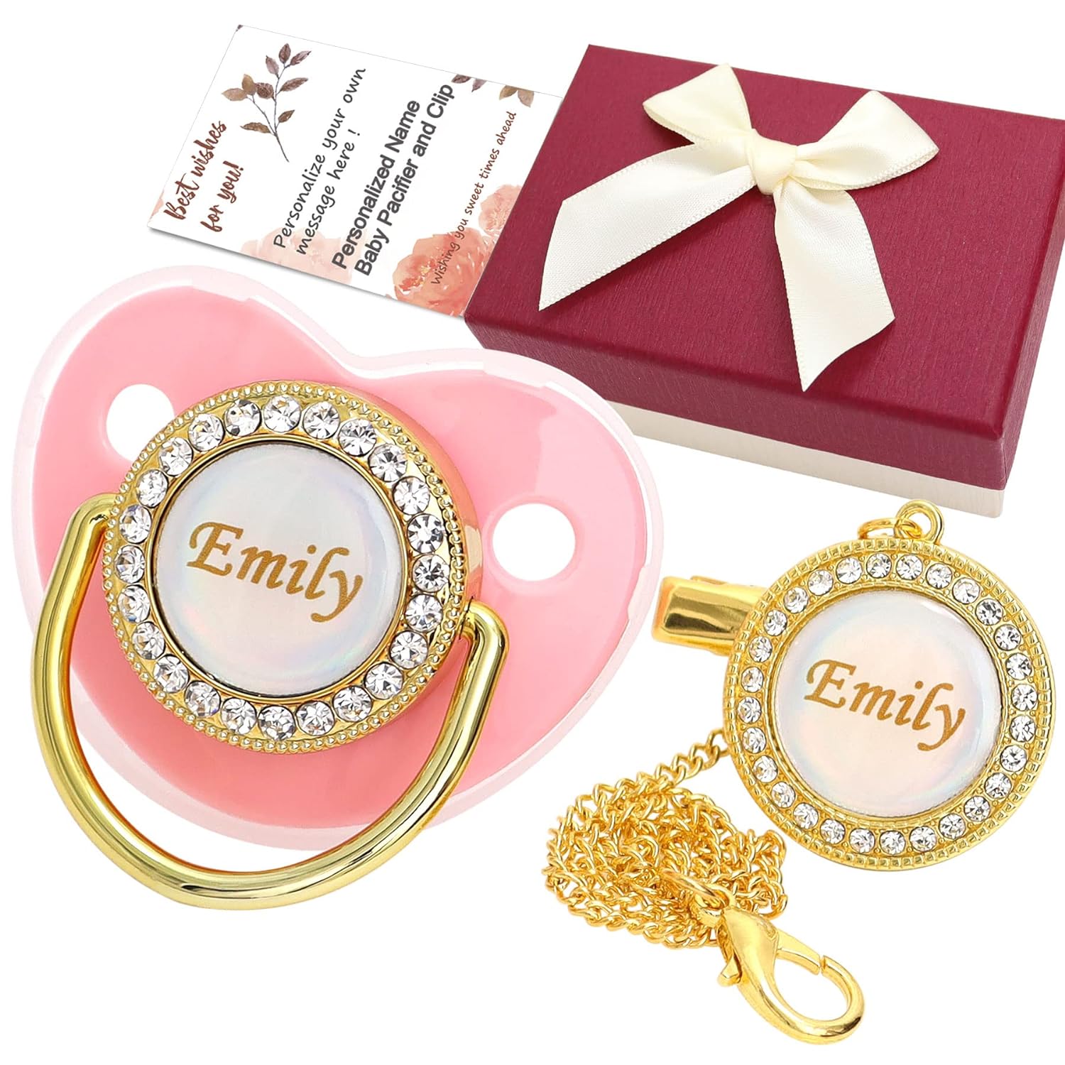 Munchewy personalized pacifier and clip set includes a personalized pacifier and clip with baby name, a custom printed greeting card with your gift message! See the “Gift Message” section to add your custom message. Besides, it was packed with an elegant gift box, which makes the best presentation possible.
