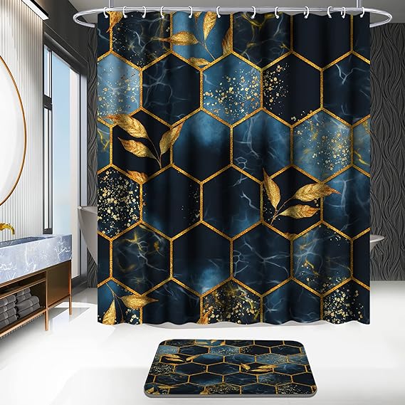 • 【Bathroom set】This Honeycomb Navy shower curtain set is made of environmentally friendly polyester fabric, which can make the water dry quickly and prevent water from splashing on the floor. The durable thick coral velvet bath mat is soft and comfortable, which can quickly absorb dripping water and help you keep it The floor is dry and tidy. It has no chemical smell and will never cause any harm to your family.