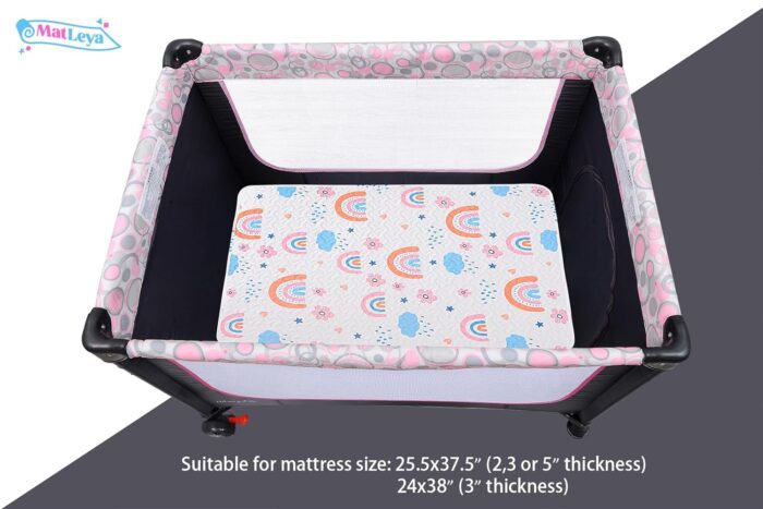 • Multiple Functions: Padded pack and play sheets are 38”x26”, thickness is 0.24 inches. Baby playpen mattress pad sheets can use as mini tummy time mats, dog bed mats, baby shower gifts or for your own nursery. Perfect for outdoor and indoor use.