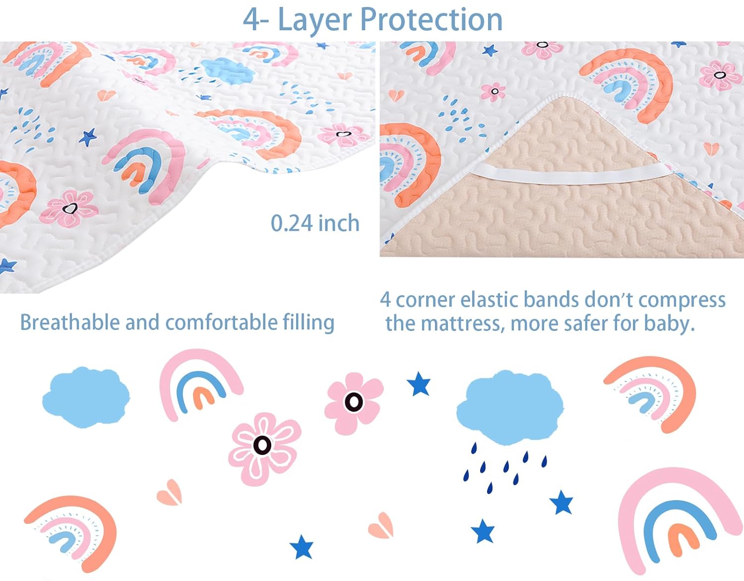 • No More Fold up, Much Safer: Pad for pack and play mattress won’t make the pack n play attached folding mattress or your added extra mattress fold up. Because 4 corner elastic bands don’t compress the mattress, very smart and safe. Easy to put on & take off with elastic straps.