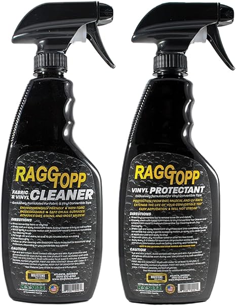 RAGGTOPP El kit de cuidado convertible de vinilo contiene una botella de limpiador RAGGTOPP y una botella de protector de vinilo RAGGTOPP para limpiar y proteger de forma segura tus tapas convertibles de vinilo según la recomendación del fabricante. Los productos de cuidado convertible RAGGTOPP están diseñados exclusivamente para el profesional del cuidado automático y los entusiastas de los convertibles que exigen el mejor limpiador y protector convertible aprobado por el fabricante. Los productos RAGGTOPP Convertible Care no contienen silicona y no dañan las ventanas de pintura, cromo, vidrio o plástico.