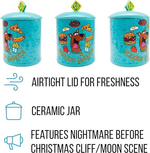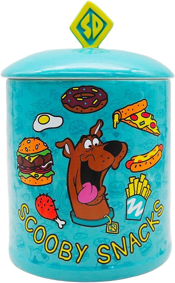 • SCOOBY SNACKS: This adorable and colorful cookie jar is perfect for holding all your favorite snacks! Cookie jar features Scooby Doo on the front surrounded by some of his favorite food and the SD logo on the top of the lid.