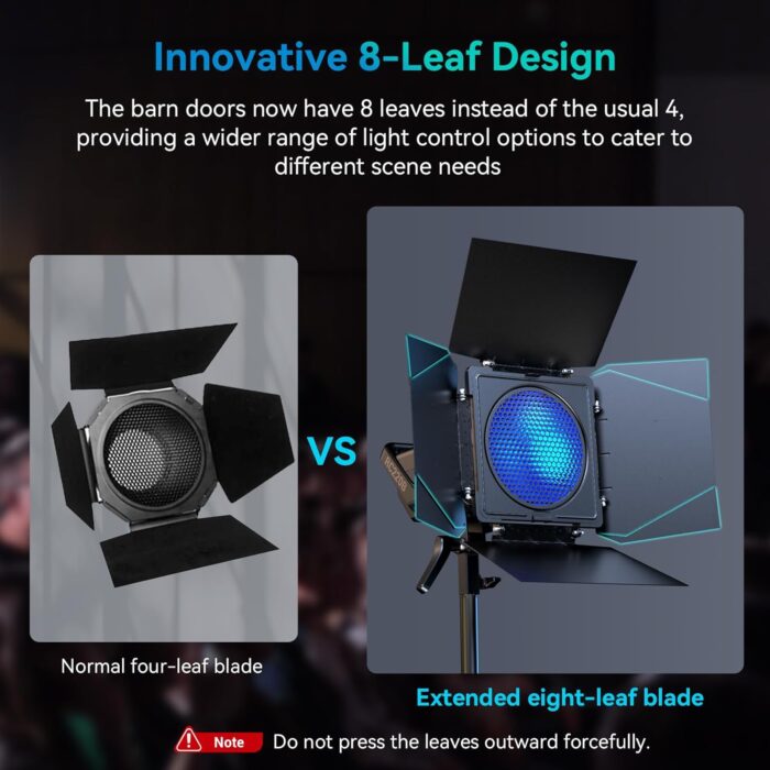 - 【Innovative 8-Leaf Design】The number of leave in the barn doors has been increased from the usual 4 to 8, allowing for a greater range and variety of light control to meet different scene requirements. With the extended and adjustable-width leave design, the barn door prevents light leakage and avoids the occurrence of unwanted glare on the background during photography.