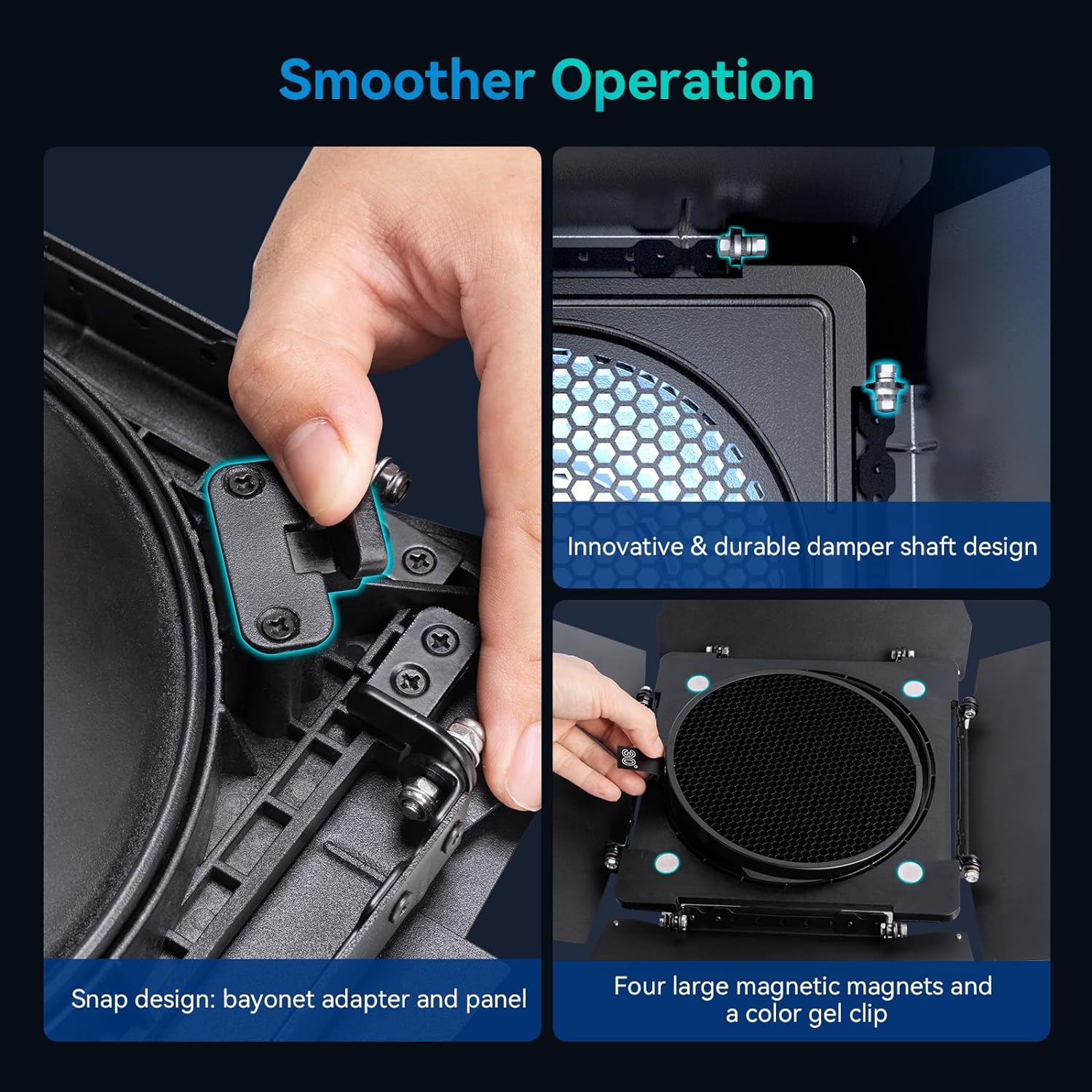 - 【User-Friendly】The leave shaft features a damping design to ensure the leave positions does not shift and provide smoother operation. The snap design between the bayonet adapter ring and the light-blocking panel ensures a tight fit and prevents detachment. With four large magnetic magnets and a color gel clip, users can use different thicknesses and materials of colored paper without worrying about them falling off.