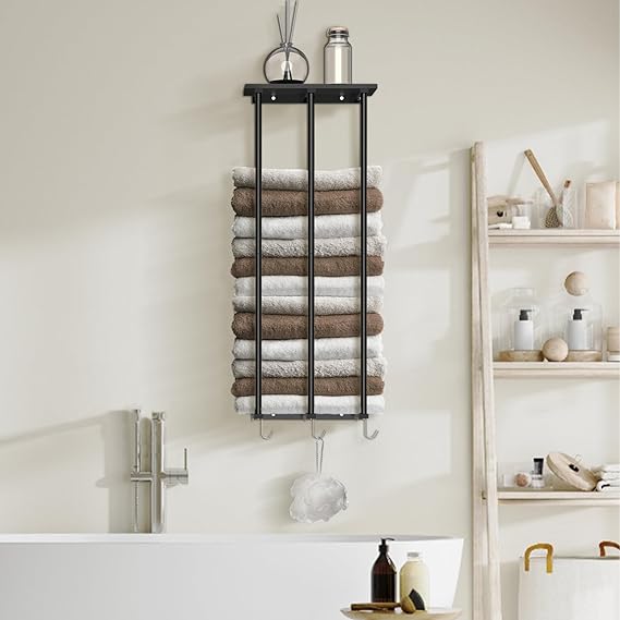 Be the first to review “Towel Racks for Bathroom Wall Mounted, MOOACE 3 Bar Adhesive Rolled Towel Storage Holders with Wood Top and 6 Hooks,Metal Bathroom Organizer for Folded Large Towel – Black” Cancel reply